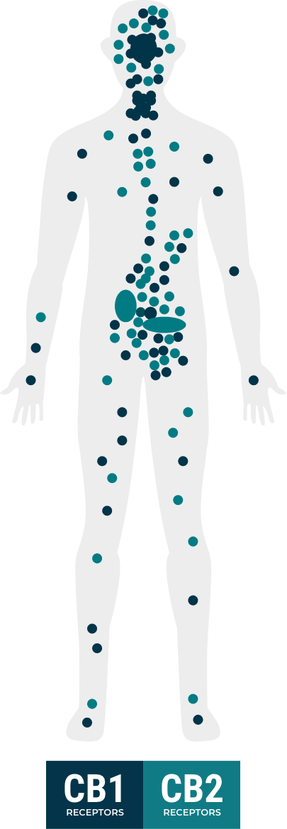 CB1 and CB2 receptors are the most abundant receptors in the entire body as they are within every system within the body. This includes the cardiovascular, pulmonary, immune, endocrine, urinary, digestive, central nervous system, muscular, skeletal, reproductive, and lymphatic system. The CB1 receptors are concentrated in the central nervous system (brain and spinal cord). The CB2 receptors are mainly found in the immune system and organs.